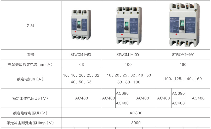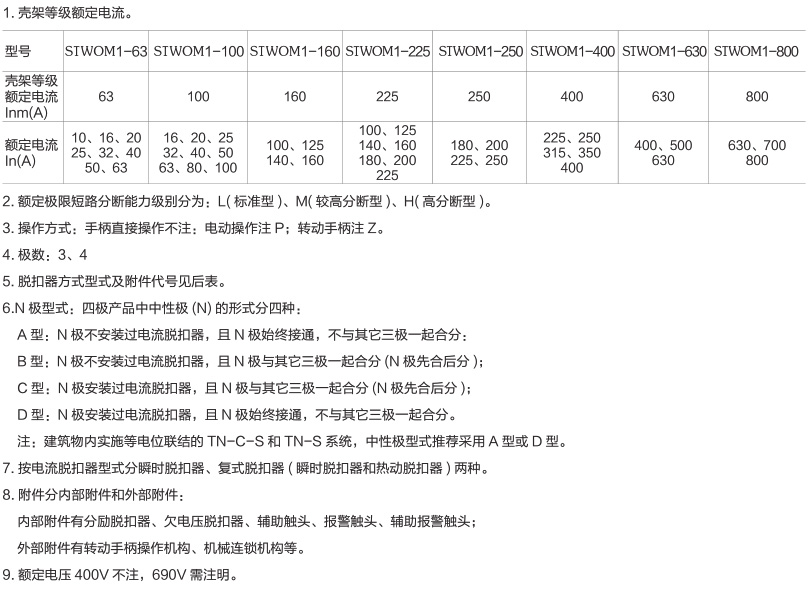 1、脱扣器类型为热磁式脱扣器,具有过载长延时保护、短路瞬时保护。