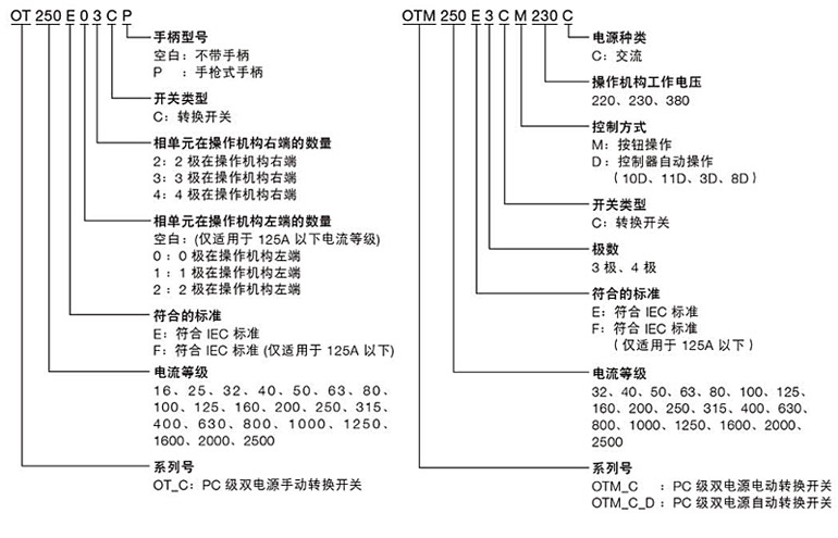 PC级和CB级双电源的区别 PC级采用隔离开关作为执行机构,能够接通和承载但不能分断短路电流,当负载过载时仍可保持供电连续性。CB级采用断路器作为执行机构,配备过电流脱扣器,自身具有对负载侧用电设备和电缆的过载保护功能,它能够接通、承载和分断短路电流,当负载出现过载短路时会断开负载。型号说明