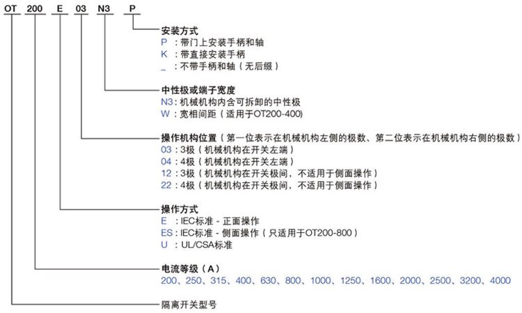 隔离开关的特点隔离开关OT,OTM,OTDC--看得见的安全 可视触头技术提供高级别的安全保证,满足隔离要求,保证人身安全 可带负荷操作 可带电动操作机构,适合远程操控应用 隔离开关熔断器组OS--将危险拒之门外 IP20防护等 级熔断器盖,防止意外触摸带电部位,保证人身安全 满足隔离,保证人身安全 可带负荷操作型号含义